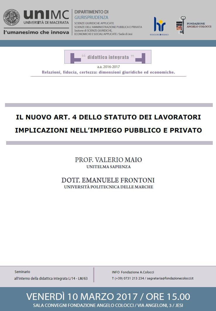 Da Ven, 10/03/2017 a Ven, 10/03/2017 Mode On-site-only 14/11/2022 JESI - Il nuovo art. 4 dello Statuto dei Lavoratori, implicazioni nell'impiego pubblico e privato on-site only | Via Angeloni, 3 - ore 15
