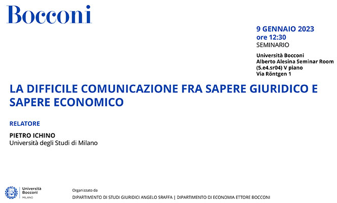 Da Lun, 09/01/2023 a Lun, 09/01/2023 Mode On-site-only File (download locandina)51.04 KB 05/01/2023 La difficile comunicazione fra sapere giuridico e sapere economico on-site only h. 12:30 | Via Röntgen 1, Milano Università Bocconi Dipartimento di Studi Giuridici Angelo Sraffa | Dipartimento di Economia Ettore Bocconi