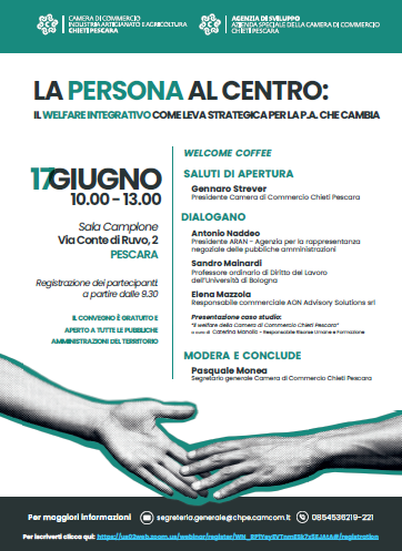 Da Mar, 17/06/2025 a Mar, 17/06/2025 Mode On-site-only File Programma1.11 MB 09/06/2025 La persona al centro: il welfare integrativo come leva strategica per la P.A. che cambia on-site only h. 10:00 | Via Conte di Ruvo 2, Pescara Per maggiori informazioni segreteria.generale@chpe.camcom.it - 0854536219-221