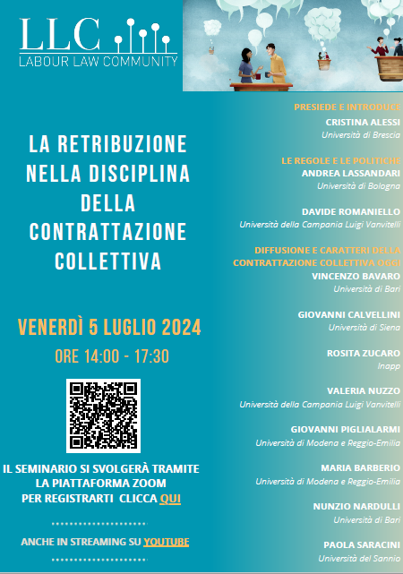 Da Ven, 05/07/2024 a Ven, 05/07/2024 Mode Online-only File Programma476.45 KB 25/06/2024 La retribuzione nella disciplina della contrattazione collettiva online only h. 14 LLC Labour Law Community Il seminario si svolgerà tramite la piattaforma ZOOM, per registrarti clicca qui anche in streaming su YOUTUBE