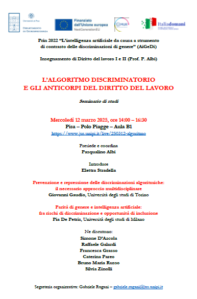 Da Mer, 12/03/2025 a Mer, 12/03/2025 Mode Hybrid File Programma123.85 KB 19/02/2025 L’algoritmo discriminatorio e gli anticorpi del diritto del lavoro hybrid h. 14 Università di Pisa Polo Piagge – Aula B1 Da remoto: https://www.jus.unipi.it/live/250312-algoritmo