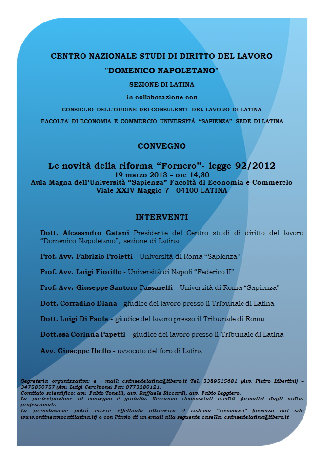 Da Mar, 19/03/2013 a Mar, 19/03/2013 Mode On-site-only 14/11/2022 LATINA - Le novità della riforma "Fornero" - legge 92/2012 on-site only | viale XXIV Maggio 7 - 14,30