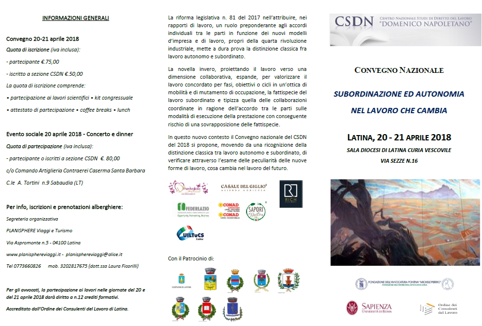 Da Ven, 20/04/2018 a Ven, 20/04/2018 Mode On-site-only 14/11/2022 LATINA - Subordinazione ed autonomia nel lavoro che cambia (20-21 aprile 2018) on-site only | Via Sezze, 16 - ore 915