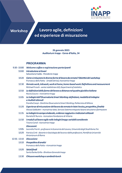 Da Gio, 26/01/2023 a Gio, 26/01/2023 Mode On-site-only File Programma205.89 KB 18/01/2023 Lavoro agile, definizioni ed esperienze di misurazione on-site h. 9.30 | Auditorium Inapp - Corso d’Italia, 34 Workshop