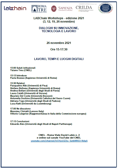 Anche l’articolazione dei tempi di lavoro, realizzata mediante contrattazione collettiva, è normalmente strutturata in relazione a luoghi dotati di una certa fisicità, non certamente rispetto a luoghi digitali. Il seminario è volto a rilevare l’impatto delle trasformazioni digitali sulle nozioni di “luogo” e “tempi” di lavoro, sulle relative forme di regolazione, sull’esercizio dei diritti sindacali, sulle prassi aziendali e sullo sviluppo della contrattazione collettiva, anche in fase post-pandemica.