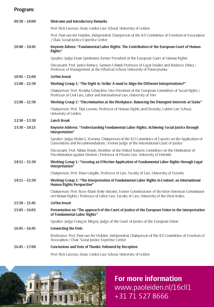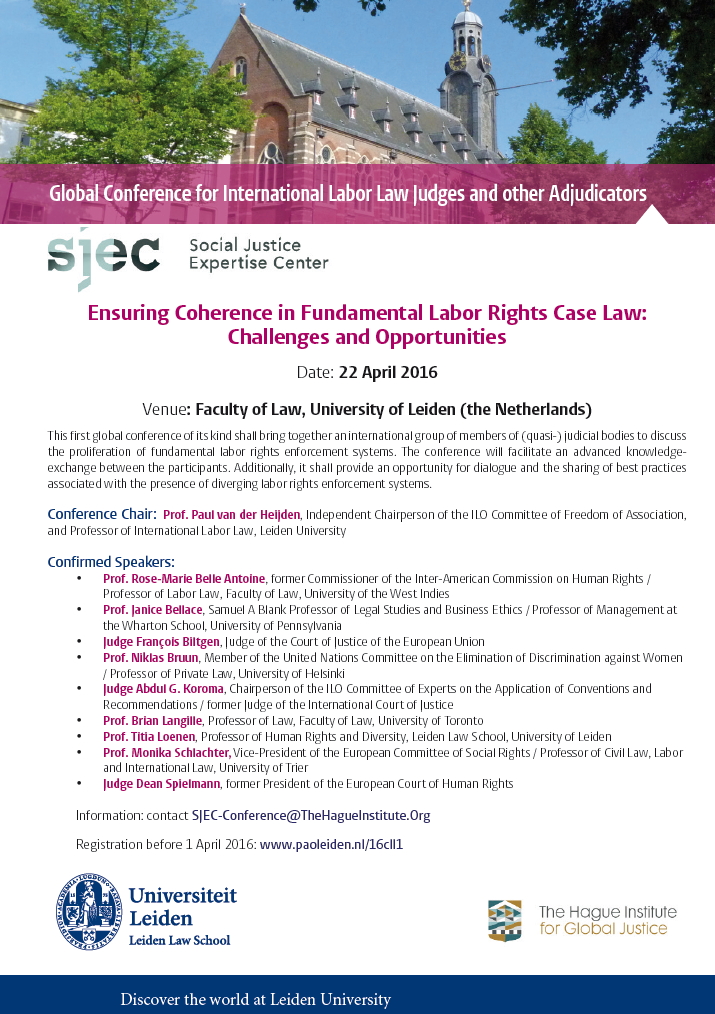 Da Ven, 22/04/2016 a Ven, 22/04/2016 Mode On-site-only 14/11/2022 LEIDEN - Ensuring Coherence in Fundamental Labor Rights Case Law: Challenges and Opportunities on-site only | Faculty of Law, University of Leiden (the Netherlands) - ore 9.30
