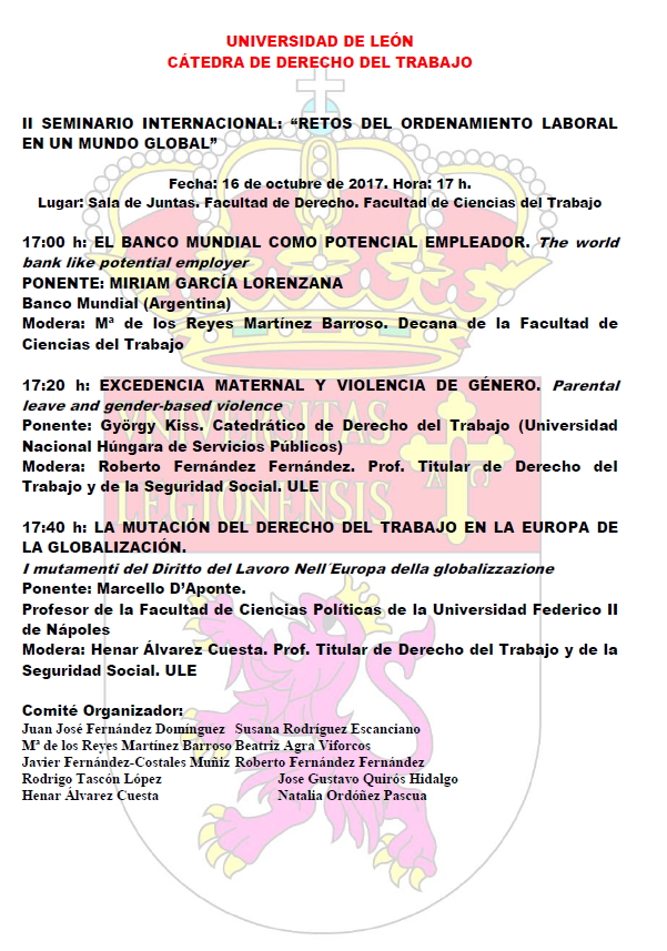 Da Lun, 16/10/2017 a Lun, 16/10/2017 Mode On-site-only 14/11/2022 LEON - Retos del ordenamiento laboral en un mundo global” on-site only | Sala de Juntas - h. 17