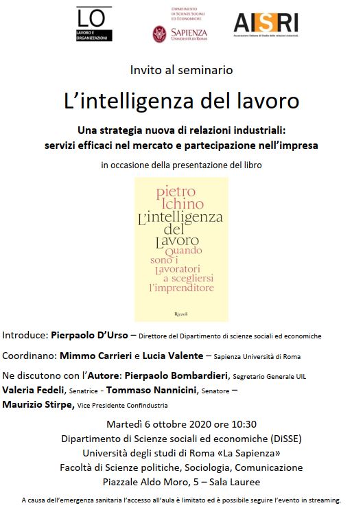Da Mar, 06/10/2020 a Mar, 06/10/2020 Mode On-site-only 14/11/2022 L'intelligenza del lavoro - Una strategia nuova di relazioni industriali: servizi efficaci nel mercato e partecipazione nell’impresa on-site only | ore 10.30 (download locandina in formato .