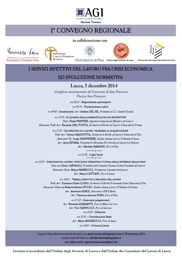 Da Ven, 05/12/2014 a Ven, 05/12/2014 Mode On-site-only 14/11/2022 LUCCA - I servizi ispettivi del lavoro fra crisi economica ed evoluzione normativa on-site only | piazza S. Francesco- 8:30