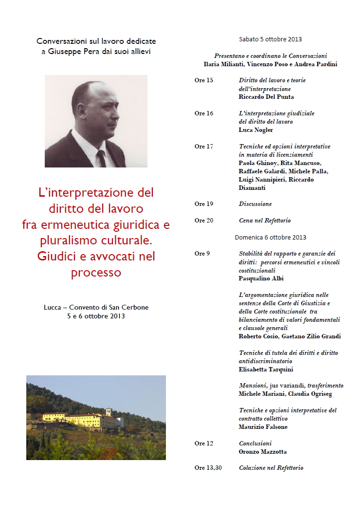 Da Sab, 05/10/2013 a Sab, 05/10/2013 Mode On-site-only 14/11/2022 LUCCA - L’interpretazione del diritto del lavoro fra ermeneutica giuridica e pluralismo culturale. Giudici e avvocati nel processo on-site only | Convento di San Cerbone - 15.00