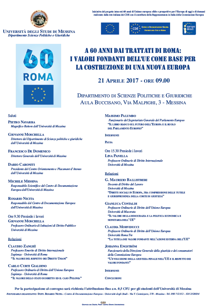 Da Ven, 21/04/2017 a Ven, 21/04/2017 Mode On-site-only 14/11/2022 MESSINA - A 60 anni dai Trattati di Roma: i valori fondanti dell'UE come base per la costruzione di una nuova Europa on-site only | Via Malpighi, 3 - ore 9