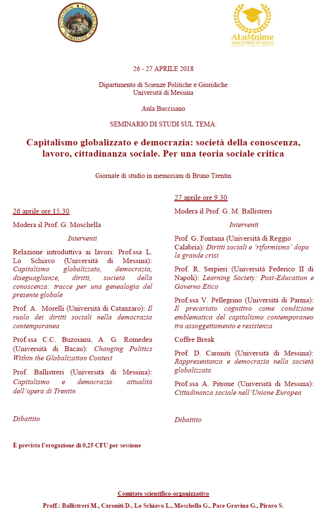MESSINA - Capitalismo globalizzato e democrazia: società della conoscenza, lavoro, cittadinanza sociale. Per una teoria sociale critica (26-27 aprile 2018)