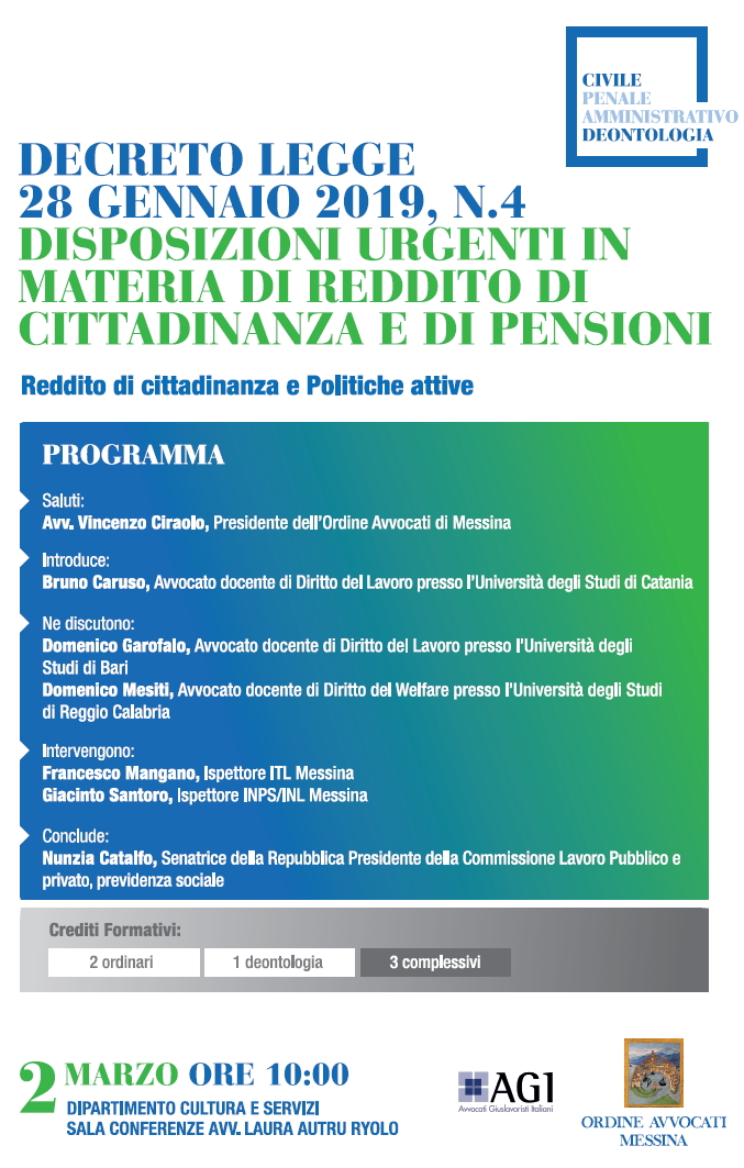 Da Sab, 02/03/2019 a Sab, 02/03/2019 Mode On-site-only 14/11/2022 MESSINA - Reddito di Cittadinanza e Politiche attive on-site only | Sala conferenze Avv. Laura Autru Ryolo - ore 10