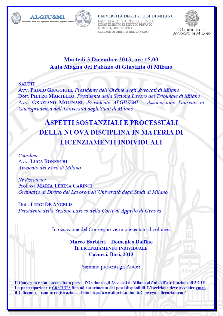 Da Mar, 03/12/2013 a Mar, 03/12/2013 Mode On-site-only 14/11/2022 MILANO - Aspetti sostanziali e processuali della nuova disciplina in materia di licenziamenti individuali on-site only | Palazzo di Giustizia, Aula Magna - 15,00