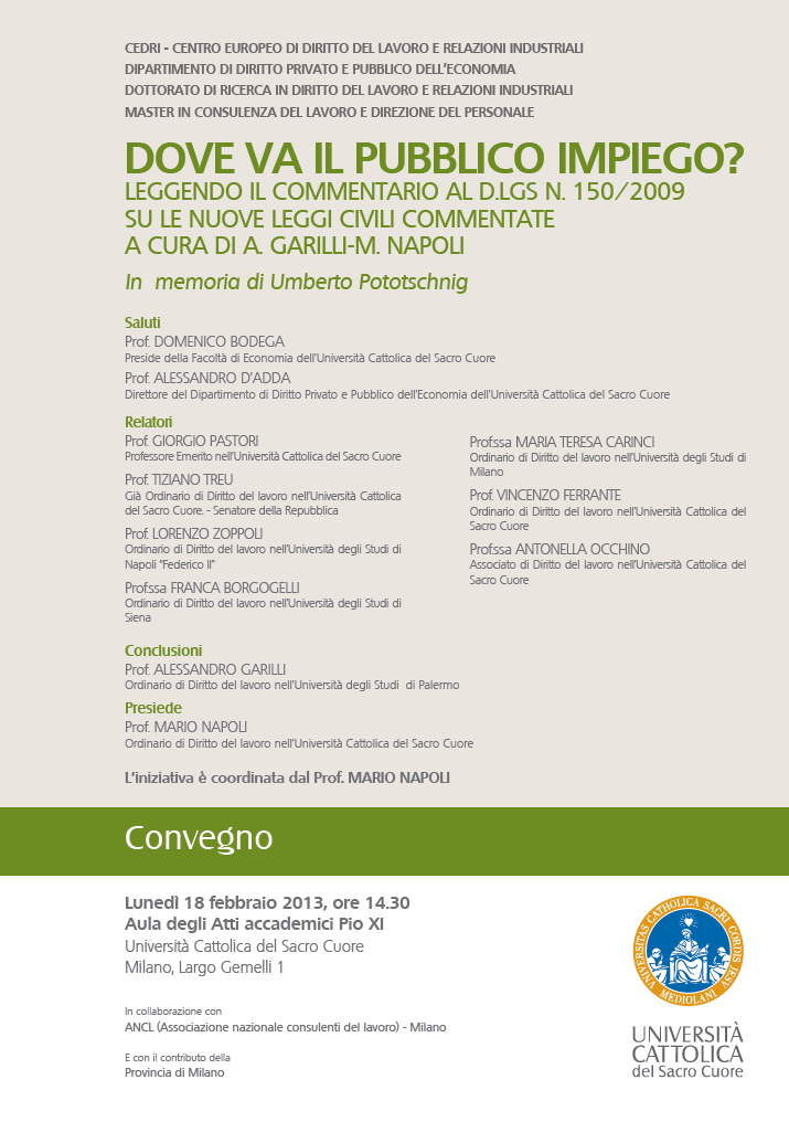Da Lun, 18/02/2013 a Lun, 18/02/2013 Mode On-site-only 14/11/2022 MILANO - Dove va il pubblico impiego? Leggendo il Commentario al D.lgs n. 150/2009 su Le nuove Leggi Civili Commentate, a cura di A. Garilli-M. Napoli on-site only | Aula degli Atti Accademici Pio XI, Università Cattolica - 14.30