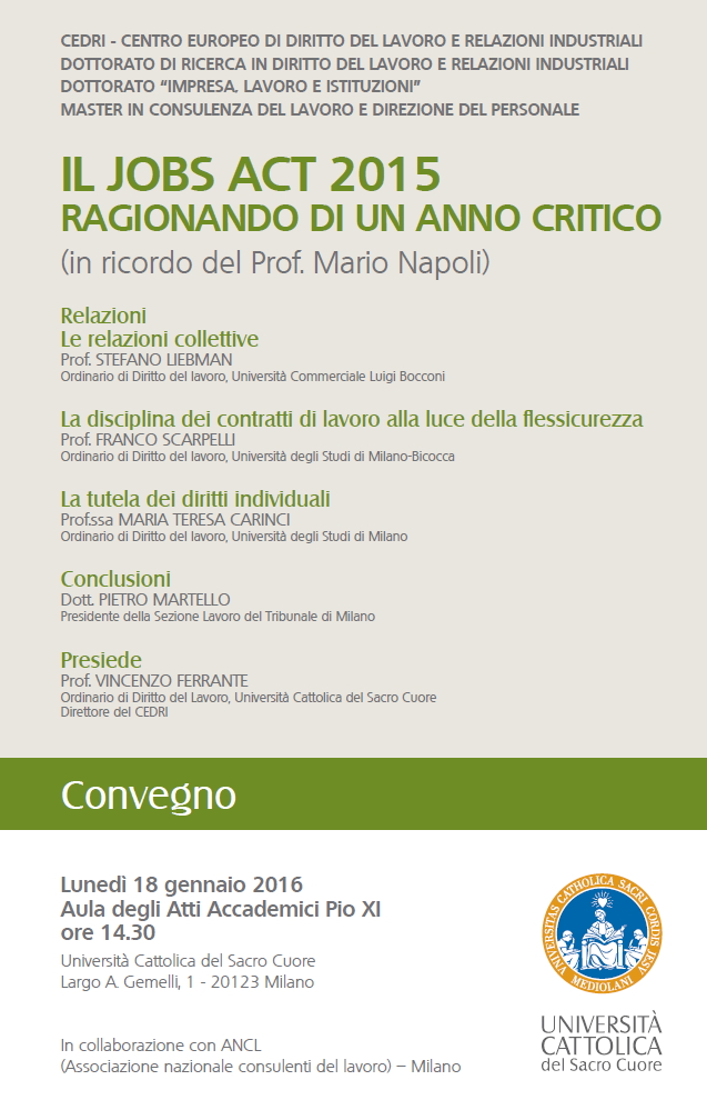 MILANO - Il Jobs act 2015 | Ragionamento di un anno critico (in ricordo del Prof. Mario Napoli)