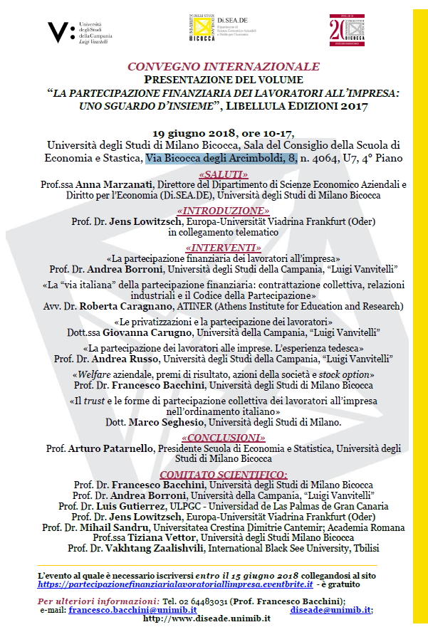 Da Mar, 19/06/2018 a Mar, 19/06/2018 Mode On-site-only 14/11/2022 MILANO - La partecipazione finanziaria dei lavoratori all'impresa: uno sguardo d’insieme on-site only | Via Bicocca degli Arcimboldi, 8 - ore 10
