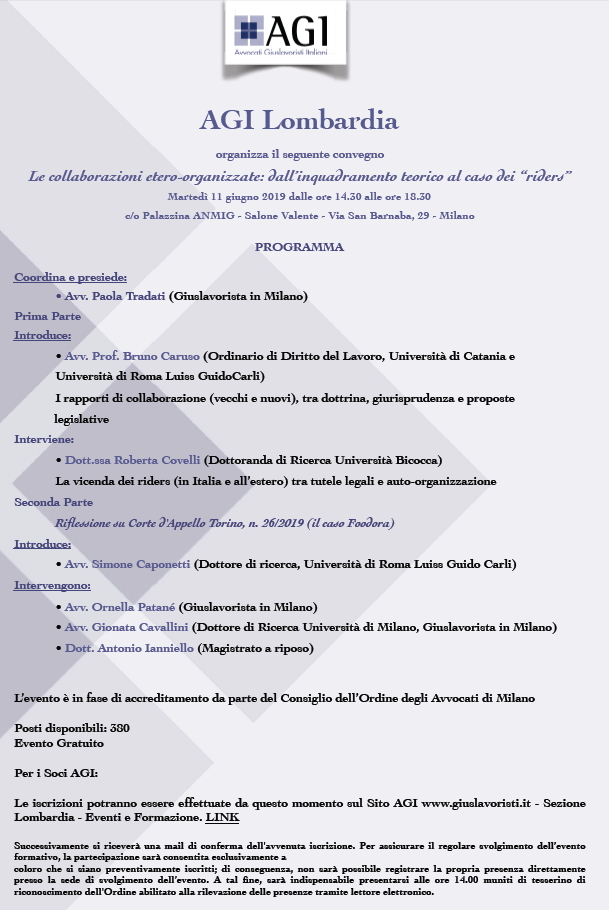 MILANO - Le collaborazioni etero-organizzate: dall'inquadramento teorico al caso dei “riders”