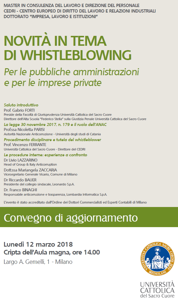 Da Lun, 12/03/2018 a Lun, 12/03/2018 Mode On-site-only 14/11/2022 MILANO - Novità in tema di whistleblowing. Per le pubbliche amministrazioni e per le imprese private on-site only | Largo A. Gemelli, 1 - ore 14