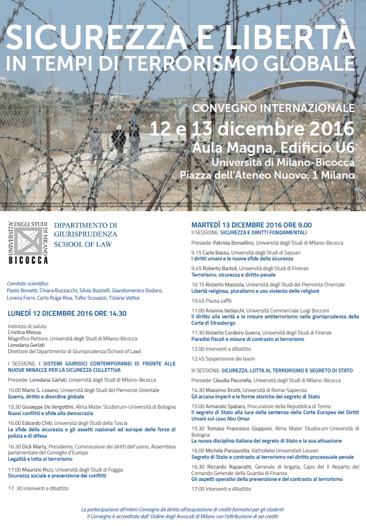 Da Lun, 12/12/2016 a Lun, 12/12/2016 Mode On-site-only 14/11/2022 MILANO - Sicurezza e libertà in tempi di terrorismo globale (12-13 dicembre 2016) on-site only | Piazza dell’Ateneo Nuovo, 1 - ore 14.30