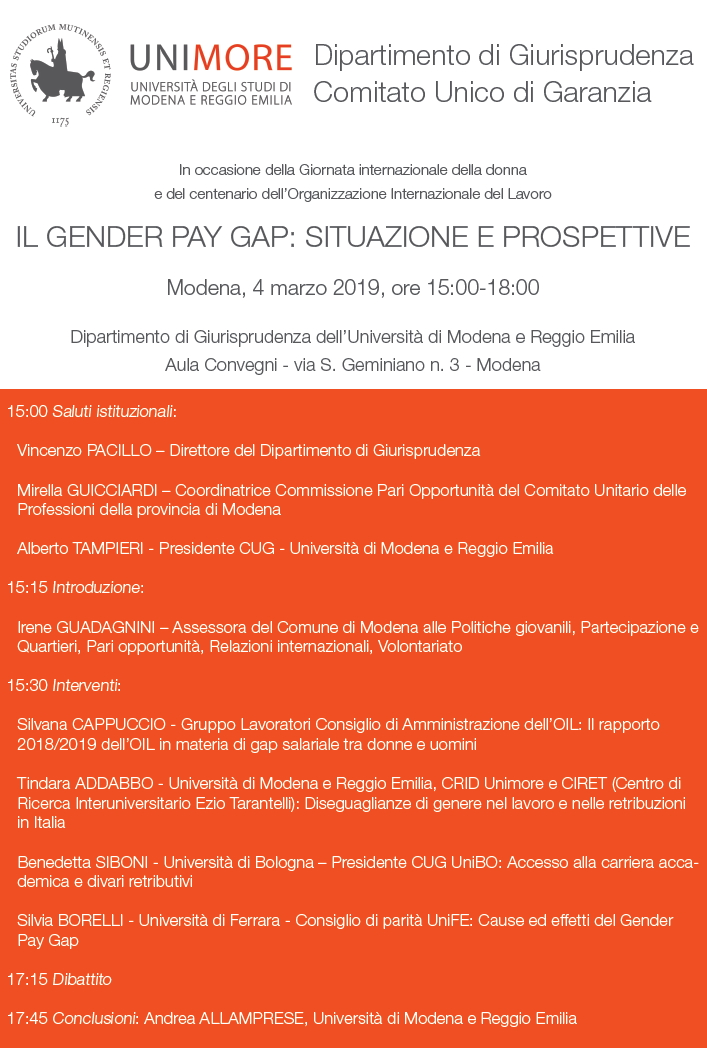 Da Lun, 04/03/2019 a Lun, 04/03/2019 Mode On-site-only 14/11/2022 MODENA - Il Gender Pay Gap: situazione e prospettive on-site only | Via S. Geminiano, 3 - ore 15