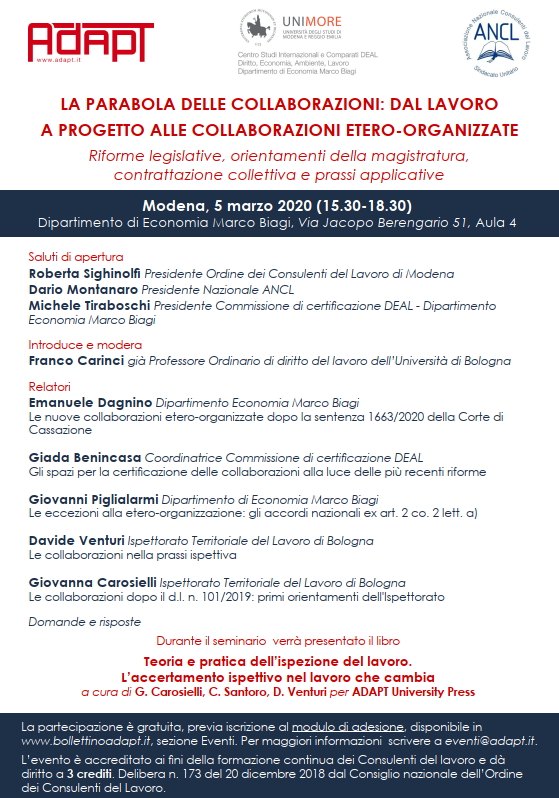 MODENA - La parabola delle collaborazioni: dal lavoro a progetto alle collaborazioni etero-organizzate - RINVIATO a data da destinarsi