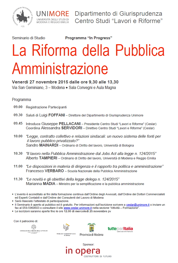 Da Ven, 27/11/2015 a Ven, 27/11/2015 Mode On-site-only 14/11/2022 MODENA - La Riforma della Pubblica Amministrazione on-site only | Via San Geminiano, 3 - ore 9:30 Per maggiori dettali consulta il