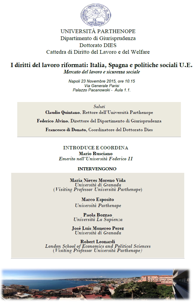 Da Lun, 23/11/2015 a Lun, 23/11/2015 Mode On-site-only 14/11/2022 NAPOLI - I diritti del lavoro riformati: Italia, Spagna e politiche sociali U.E. | Mercato del lavoro e sicurezza sociale on-site only | Via Generale Parisi | Palazzo Pacanowski - Aula 1.1. - ore 10:15