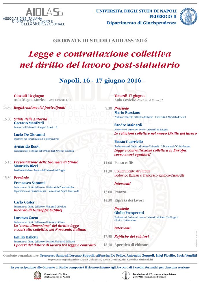 Da Gio, 16/06/2016 a Gio, 16/06/2016 Mode On-site-only 14/11/2022 NAPOLI - Legge e contrattazione collettiva nel diritto del lavoro post-statutario (16-17 giugno 2016) on-site only | Corso Umberto I, 40 - ore 14.30 -