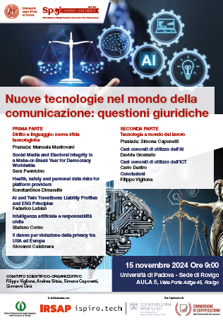 Da Ven, 15/11/2024 a Ven, 15/11/2024 Mode On-site-only File Programma604.63 KB 12/11/2024 Nuove tecnologie nel mondo della comunicazione: questioni giuridiche on-site only h. 9:00 | Viale Porta Adige 45, Rovigo Università di Padova - Sede di Rovigo AULA 5