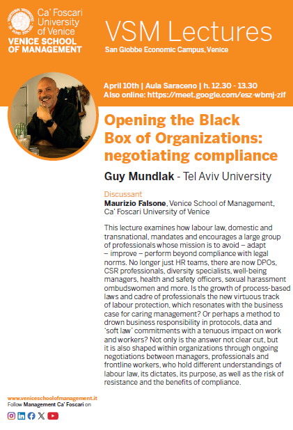 Da Gio, 10/04/2025 a Gio, 10/04/2025 Mode Hybrid File Programme186.44 KB 02/04/2025 Opening the Black Box of Organizations: negotiating compliance hybrid h. 12.30 Ca’ Foscari University of Venice - Aula Saraceno Online: https://meet.google.com/esz-wbmj-zif