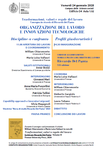 Durante il convegno sarà presentato il volume William Chiaromonte e Maria Luisa Vallauri (a cura di) Trasformazioni, valori e regole del lavoro