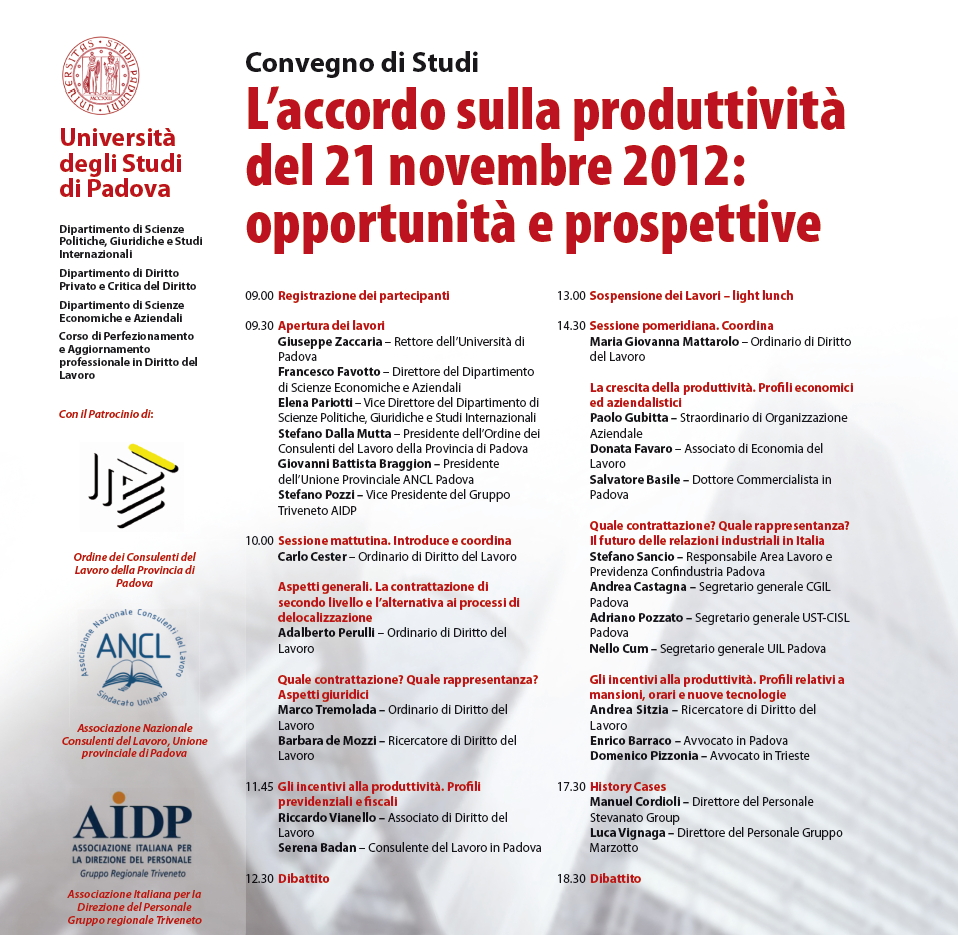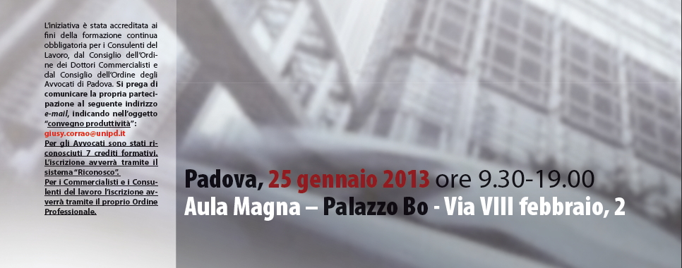 Da Ven, 25/01/2013 a Ven, 25/01/2013 Mode On-site-only 14/11/2022 PADOVA - L’accordo sulla produttività del 21 novembre 2012: opportunità e prospettive on-site only | Aula Magna – Palazzo Bo - 9.00