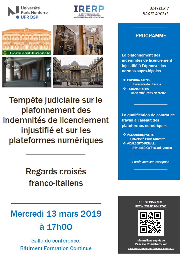 Da Mer, 13/03/2019 a Mer, 13/03/2019 Mode On-site-only 14/11/2022 PARIGI - Tempête judiciaire sur les indemnités de licenciement injustifié et les plateformes numériques : Regards croisés franco-italiens on-site only | Salle de conférence - h. 17