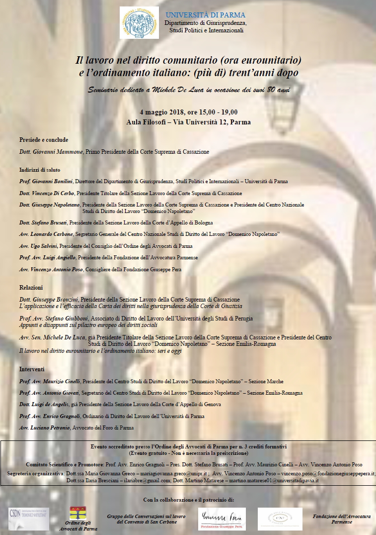 PARMA - Il lavoro nel diritto comunitario (ora eurounitario) e l’ordinamento italiano: (più di) trent’anni dopo | Seminario dedicato a Michele De Luca in occasione dei suoi 80 anni