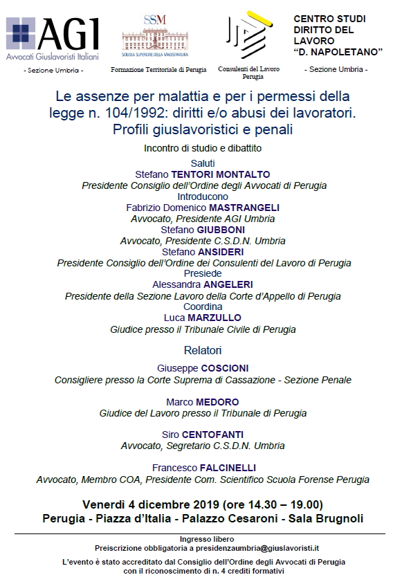 PERUGIA - Le assenze per malattia e per i permessi della legge n. 104/1992: diritti e/o abusi dei lavoratori. Profili giuslavoristici e penali