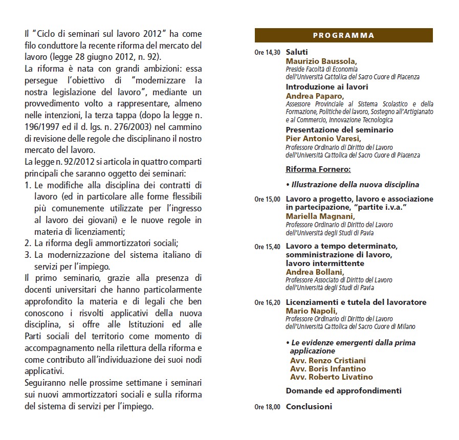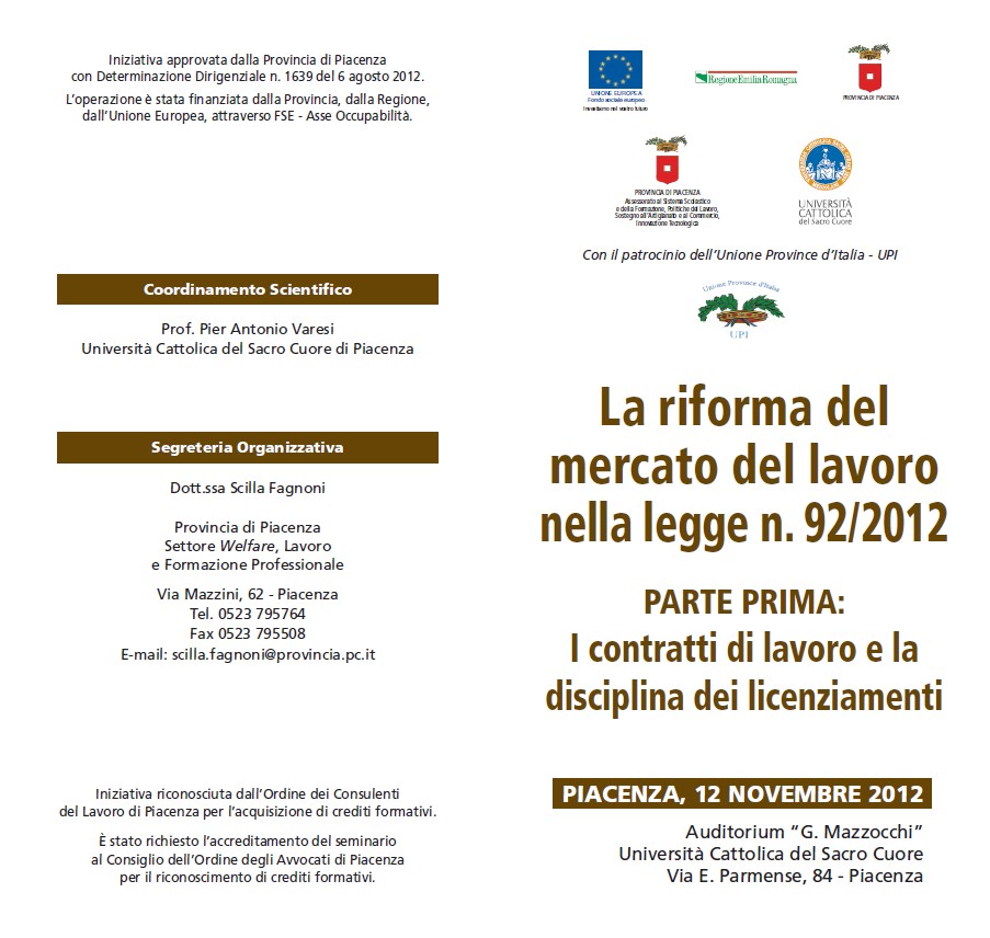 PIACENZA - La riforma del mercato del lavoro nella legge n. 92/2012 - Parte prima: I contratti di lavoro e la disciplina dei licenziamenti