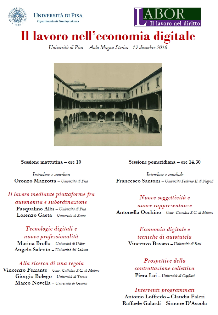 Da Gio, 13/12/2018 a Gio, 13/12/2018 Mode On-site-only 14/11/2022 PISA - Il lavoro nell’economia digitale on-site only | Aula Magna Storica - ore 10