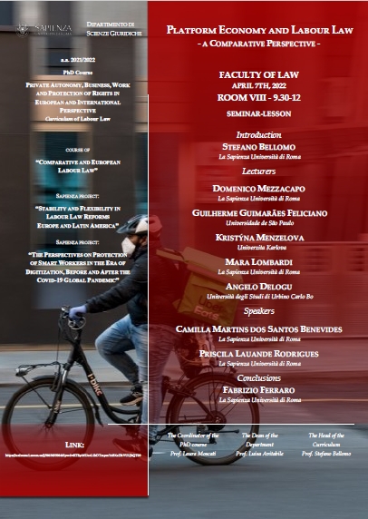 Da Gio, 07/04/2022 a Gio, 07/04/2022 Mode Hybrid File (download locandina)262.64 KB 25/03/2022 Platform economy and labour law - A comparative perspective hybrid h. 9.30 LINK: https://uniroma1.zoom.us/j/98654559844?pwd=RTBpMUoxL1hDTmpmYzBXaDhVU1JhQT09