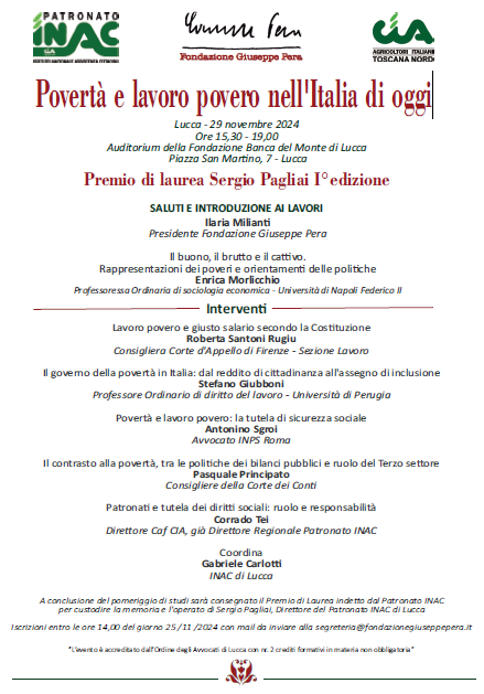 A conclusione del pomeriggio di studi sarà consegnato il Premio di Laurea indetto dal Patronato INAC per custodire la memoria e l'operato di Sergio Pagliai, Dire