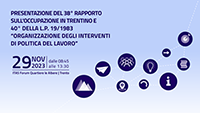 L'appuntamento, organizzato da Agenzia del Lavoro della Provincia Autonoma di Trento con la collaborazione di Tsm-Trentino School of Management, sarà un'importante occasione per presentare i dati dell'andamento del mercato del lavoro in Trentino nel 2022 e nei primi mesi del 2023 e, al contempo, per ripercorrere i quarant'anni anni di impegno dell'Agenzia del Lavoro della Provincia autonoma di Trento e delle parti sociali nelle politiche del lavoro.