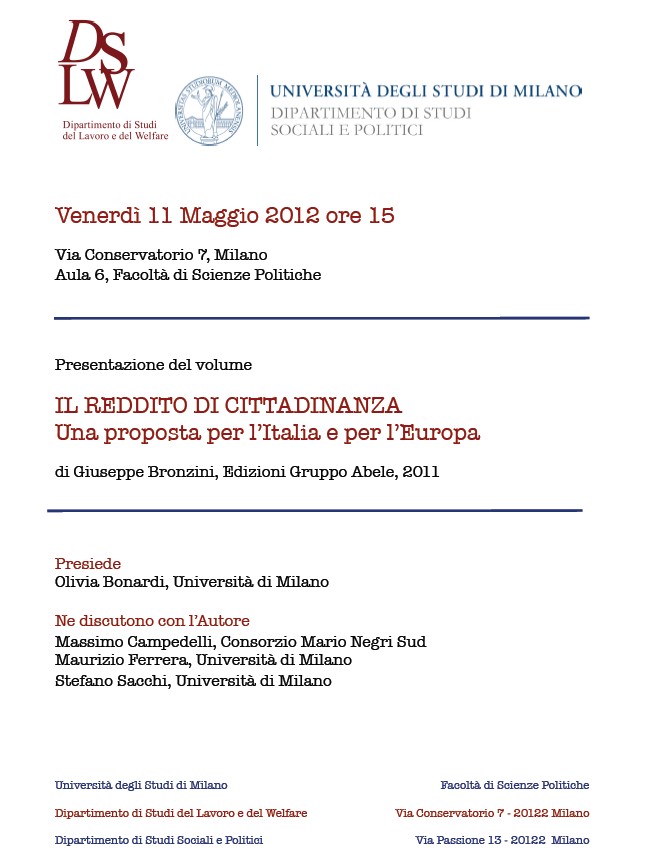 Presentazione del volume “Il reddito di cittadinanza. Una proposta per l’Italia e per l’Europa” di Giuseppe Bronzini, Edizioni Gruppo Abele, 2011