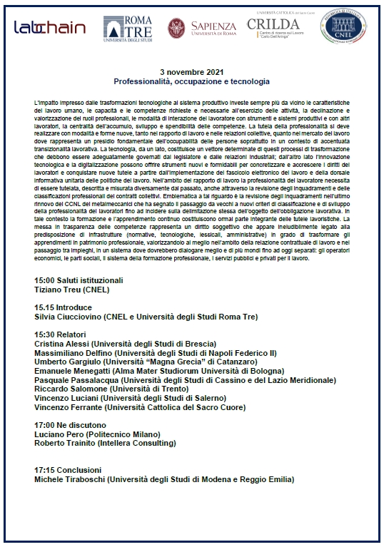 Chiunque intenda partecipare ai lavori in presenza presso il Parlamentino del CNEL, segnali pure la propria partecipazione al Dott. Matteo Verzaro (matteo.verzaro@uniroma3.it) entro il 30.10.2021 CNEL - Roma Viale David Lubin n. 2 e online sul canale YouTube del CNEL youtube.com/channel/UCHjo1SZ3u_EatbNREO-NdqA