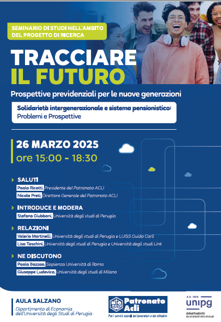Da Mer, 26/03/2025 a Mer, 26/03/2025 Mode On-site-only File Programma1.24 MB 03/03/2025 Prospettive previdenziali per le nuove generazioni on-site only h. 15:00 | Via Alessandro Pascoli 20, Perugia Università di Perugia Aula Salzano - Dipartimento di Economia