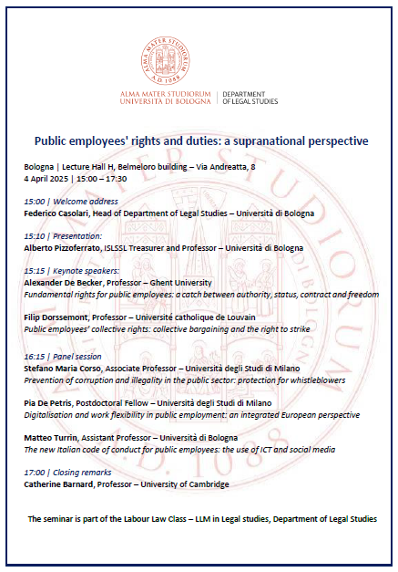 Da Ven, 04/04/2025 a Ven, 04/04/2025 Mode On-site-only File Programme387.53 KB 31/03/2025 Public employees' rights and duties: a supranational perspective on-site only h. 15:00 | Via Andreatta 8, Bologna Alma Mater Studorium Department of Legal Studies - Lecture Hall H, Belmeloro building