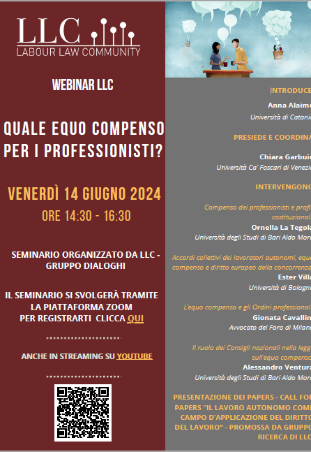 Da Ven, 14/06/2024 a Ven, 14/06/2024 Mode Online-only File Programma202.91 KB 30/05/2024 Quale equo compenso per i professionisti? online only h. 14.30 LLC - Labour Law Community Piattaforma Zoom: link Canale YouTube: link