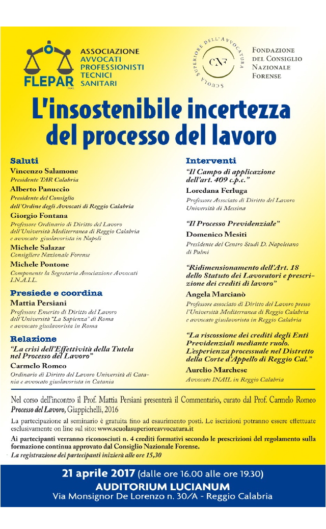 Da Ven, 21/04/2017 a Ven, 21/04/2017 Mode On-site-only 14/11/2022 REGGIO CALABRIA - L'insostenibile incertezza del processo del lavoro on-site only | Via Monsignor De Lorenzo, 30/A - ore 16