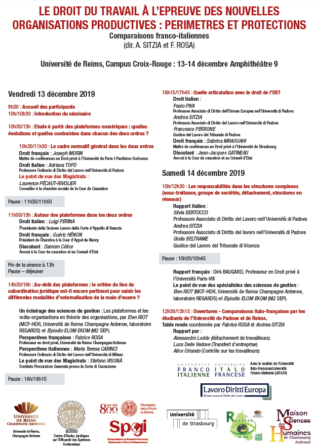 REIMS - Le droit du travail à l'epreuve des nouvelles organisations productives : perimetres et protection (13-14 dicembre 2019)