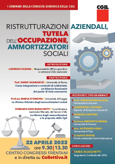 Da Ven, 22/04/2022 a Ven, 22/04/2022 Mode On-site-only File (download locandina)49.77 KB 15/04/2022 Ristrutturazioni aziendali, tutela dell'occupazione, ammortizzatori sociali on-site only h. 9.30 | Centro Congressi Frentani, Roma Sede CGIL nazionale e in diretta su Collettiva.it
