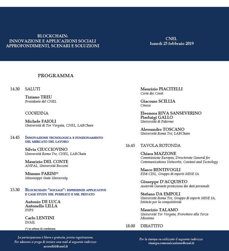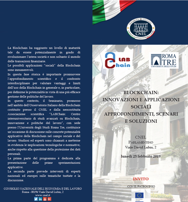 Da Lun, 25/02/2019 a Lun, 25/02/2019 Mode On-site-only 14/11/2022 ROMA - Blockchain: innovazioni e applicazioni sociali. Approfondimenti, scenari e soluzioni on-site only | Viale David Lubin, 2 - ore 14.30